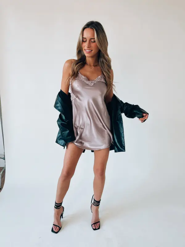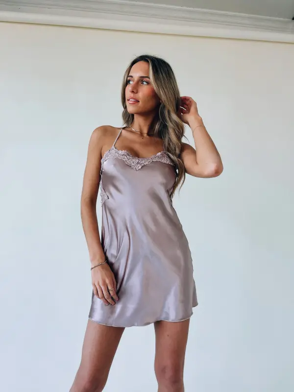 Our Annyston Mauve Slip Dress is a mini dress with a very soft silk fabric. On the dress there is a lace detail that has some shine and the lace is on the front and the back. This dress has two thin adjustable straps that cross in the back for a crossed back detail. There is no lining on the inside but it is not see through. It runs true to size and there is a good stretch in the fabric.