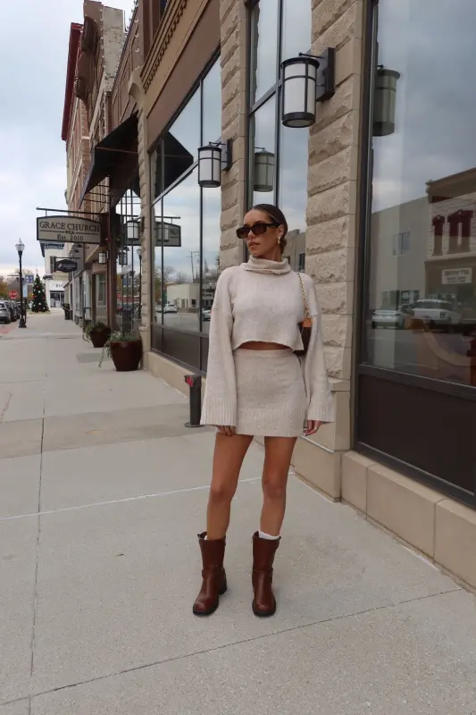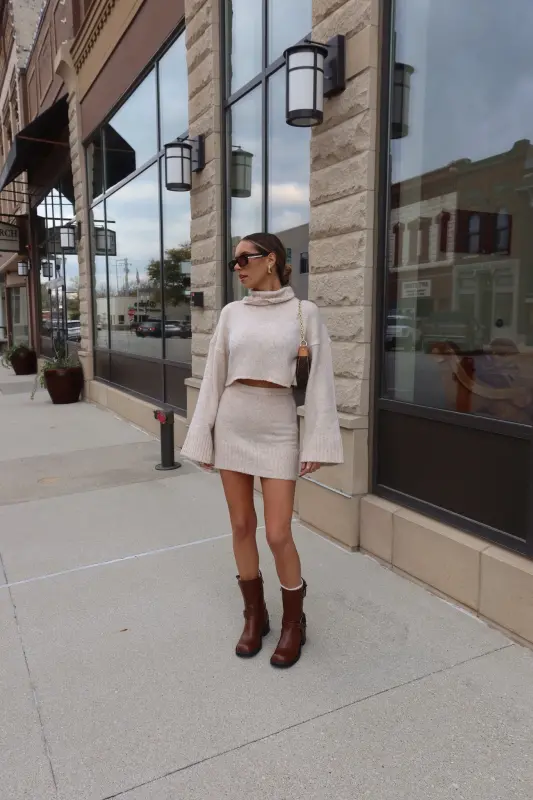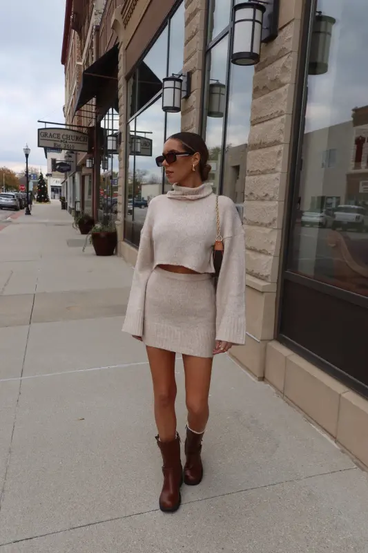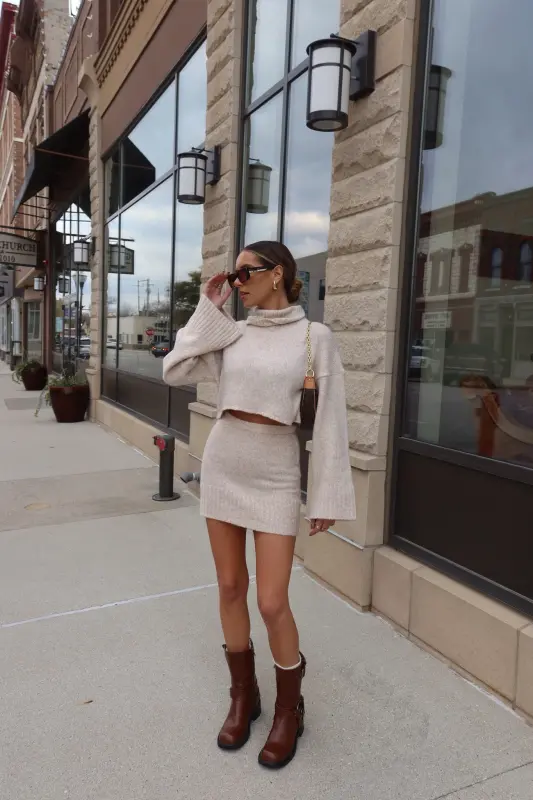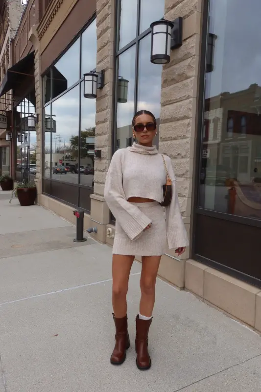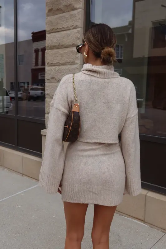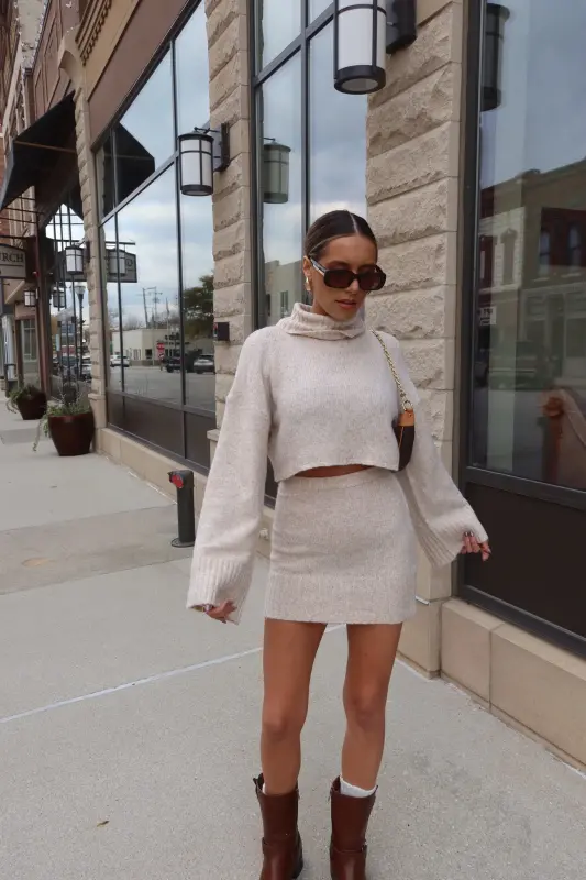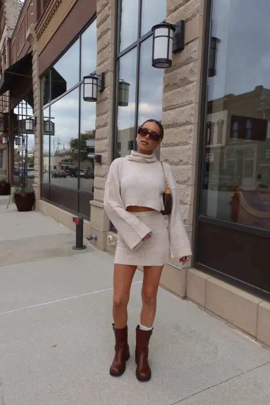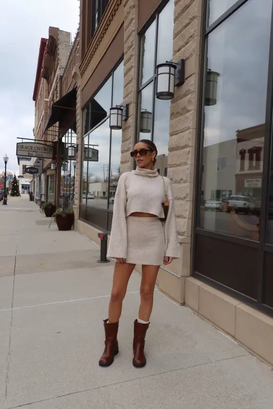 Discover refined style with the Arianna Cropped Turtleneck Knit in luxurious oat. This thoughtfully designed sweater combines classic elegance with contemporary flair, featuring a cozy turtleneck and perfectly cropped length that sits beautifully at the waist. The premium knit construction ensures both comfort and sophistication, creating a polished silhouette that's both flattering and versatile. Designed as part of a coordinated set, this piece pairs seamlessly with our matching knit skirt for a complete, elevated look. The timeless oat hue adds warmth to your wardrobe, making it perfect for both statement coordinated outfits or as a standalone piece paired with your favorite bottoms.