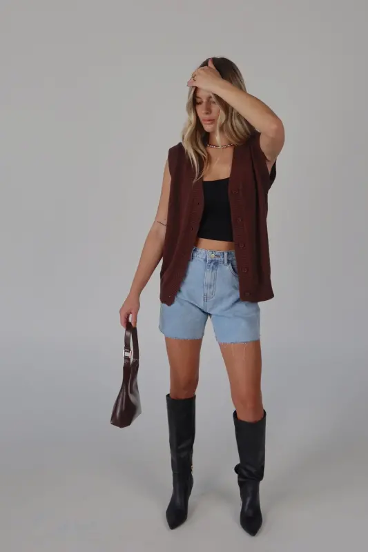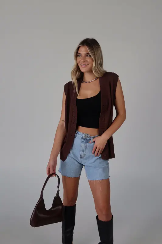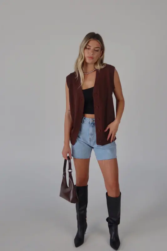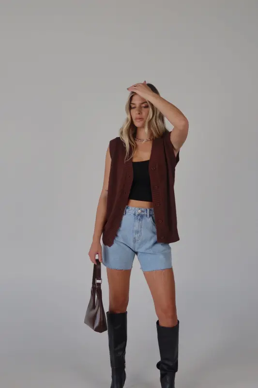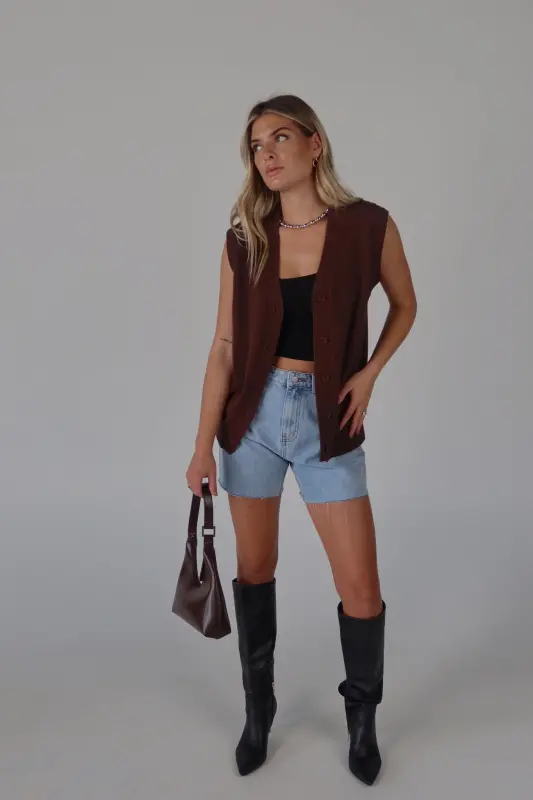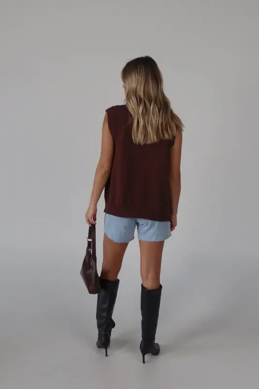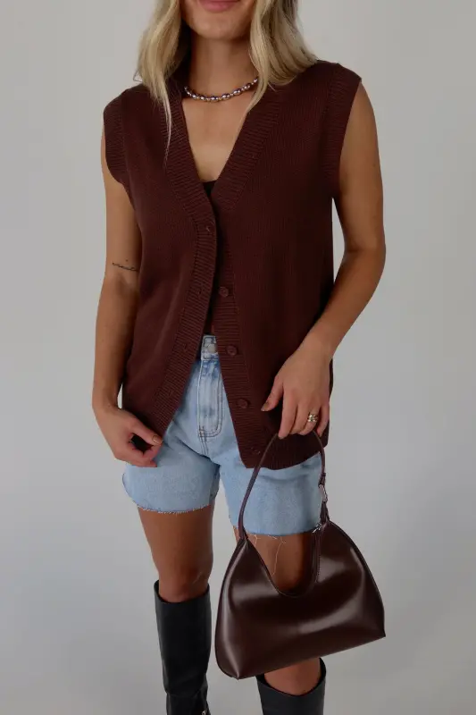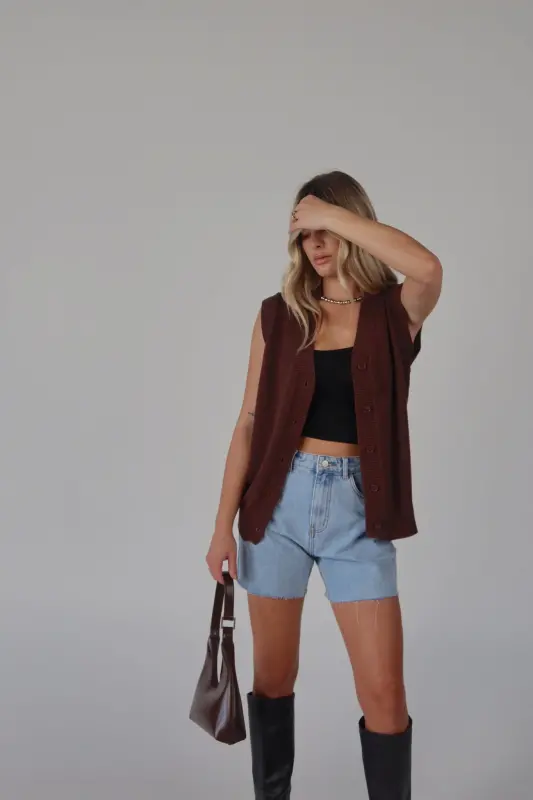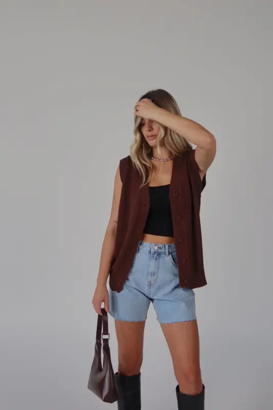 Stay effortlessly chic with this Brown Sleeveless Button-Down Sweater. Crafted from 100% cotton, this full-length sweater offers a breathable, soft feel perfect for layering or wearing on its own. The sleeveless design and button-down front add a modern twist to a classic silhouette, making it an ideal piece for transitioning between seasons. Pair it with your favorite jeans or skirts for a versatile look that combines style and comfort.