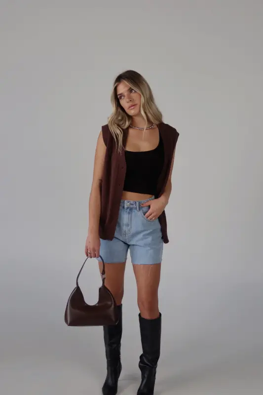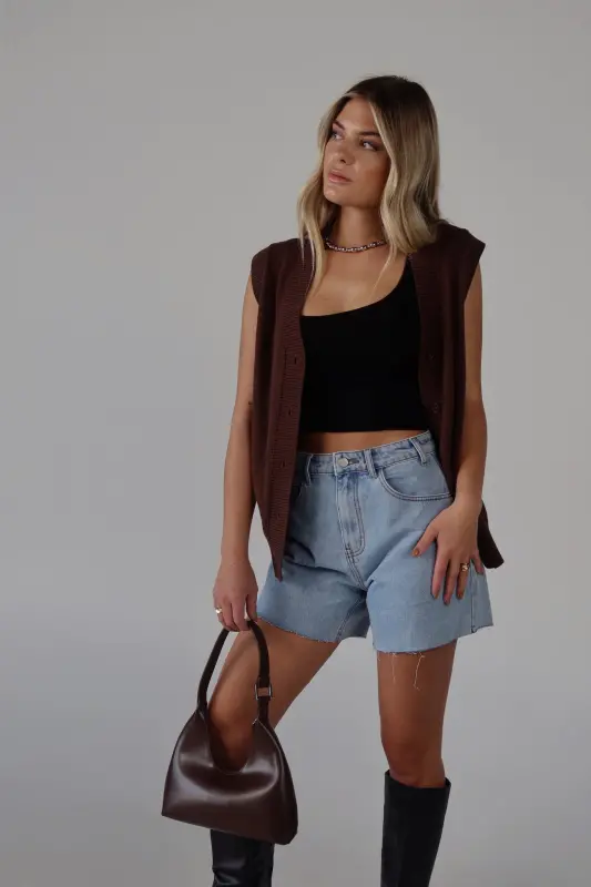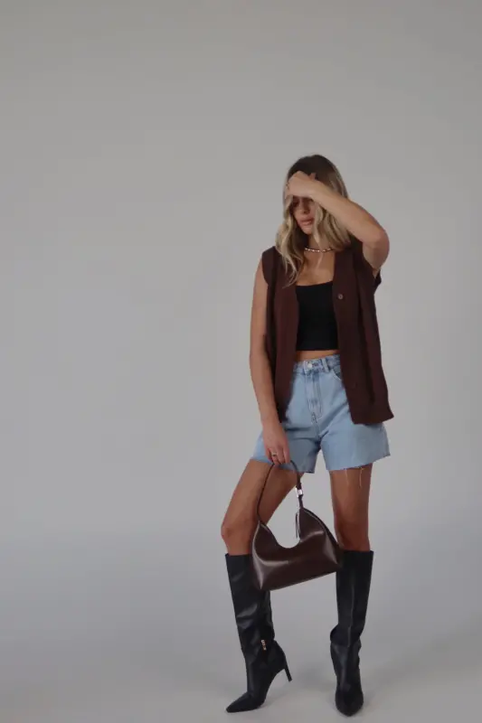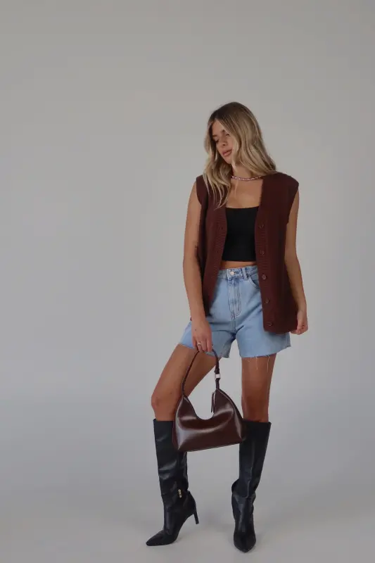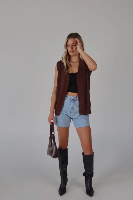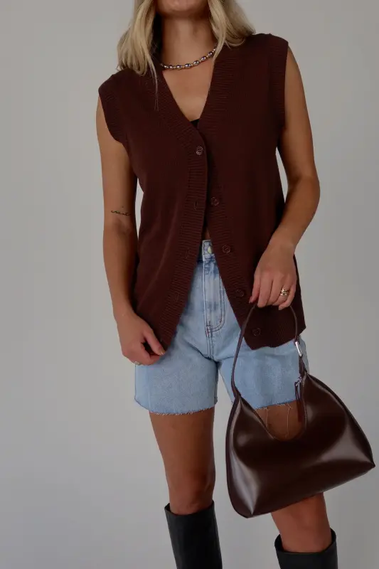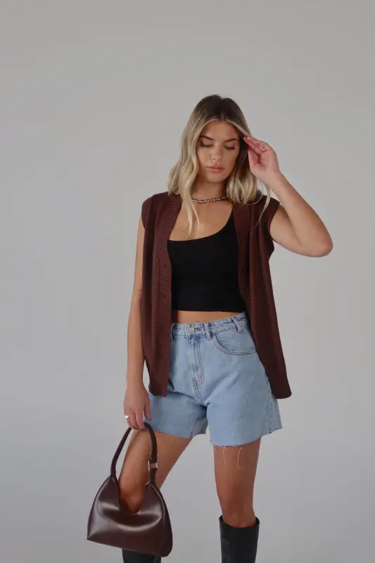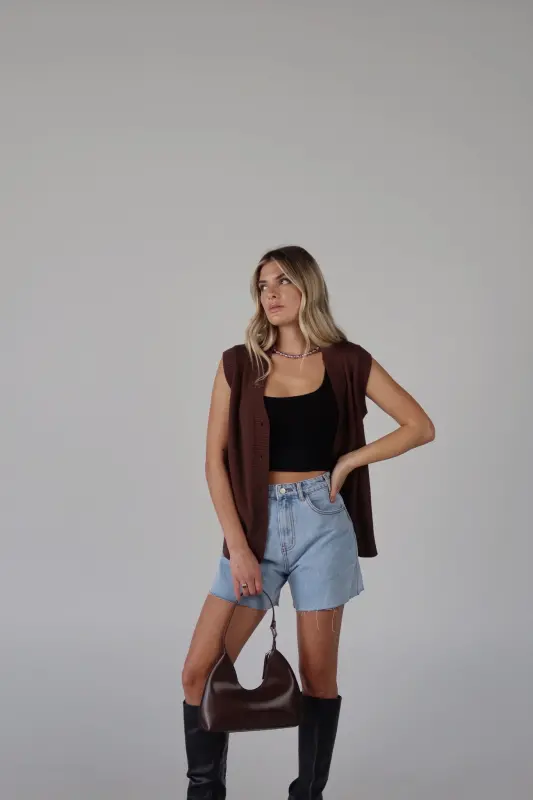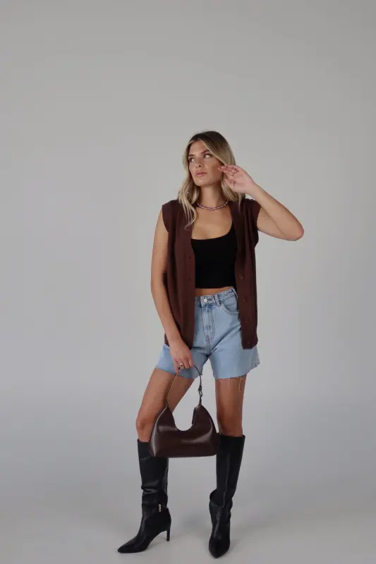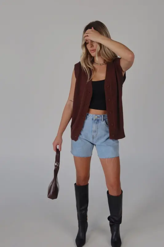 Stay effortlessly chic with this Brown Sleeveless Button-Down Sweater. Crafted from 100% cotton, this full-length sweater offers a breathable, soft feel perfect for layering or wearing on its own. The sleeveless design and button-down front add a modern twist to a classic silhouette, making it an ideal piece for transitioning between seasons. Pair it with your favorite jeans or skirts for a versatile look that combines style and comfort.