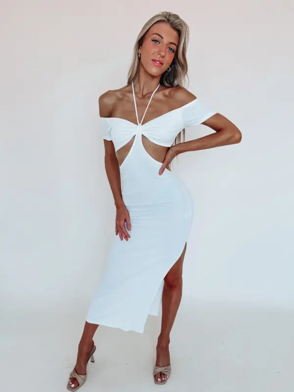 Our Caliana Cut Out Midi Dress has a soft to the touch ribbed fabric. This midi dress has an off the shoulder detail with two front cut out details. This dress has a two sting halter closure. The dress also has a side slit detail. The inside of this dress is NOT lined.