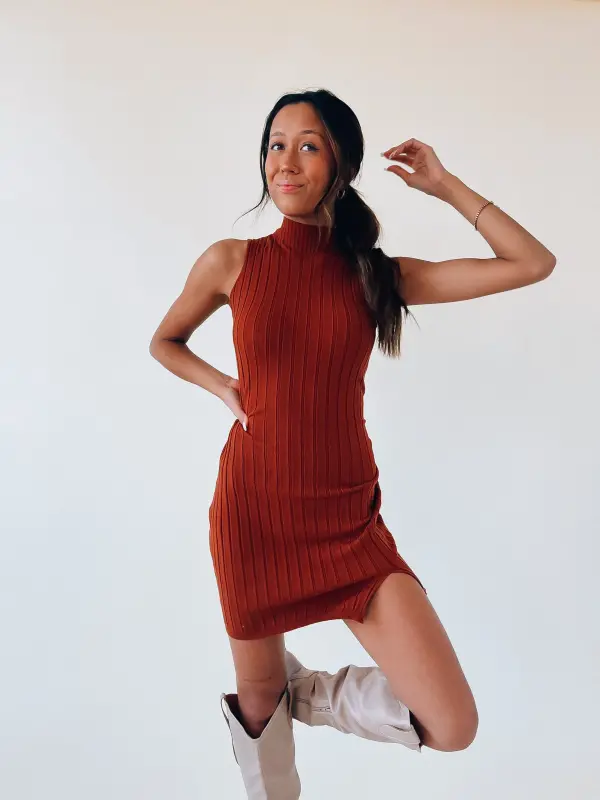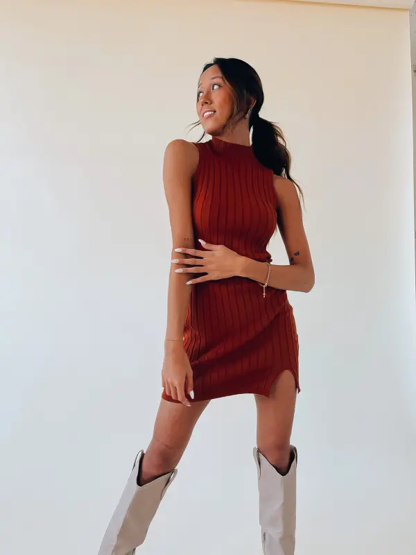 Our Khloe Mock Neck Mini Dress is a sleeveless, fitted, ribbed, mini dress. There is a mini v slit on the front. This ribbed fabric has a great stretch for comfort. The inside of this dress is NOT LINED!