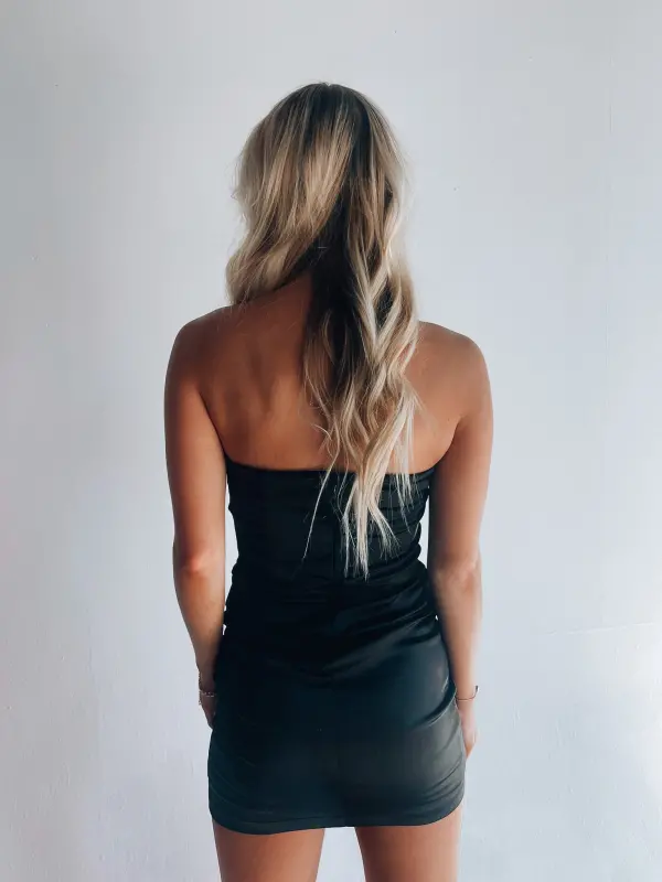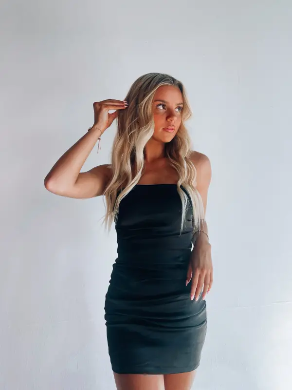 Our Lula Strapless Silk Mini Dress is an adorable fitted mini dress with a soft to the touch silky fabric that has a ruching detail. The inside of this item is LINED and also has a no slip grip to help keep it in place. There is a back zipper closure with a hook and eye clasp.