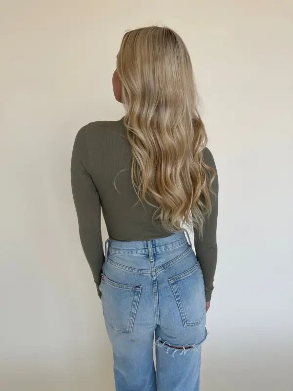 Our Monika Mockneck Bodysuit is a light weight long sleeve bodysuit with a mock neckline and fitted bodice. This lightweight ribbed turtlenck features side cut outs, hidden back zipper along the neckline, and button closure. This olive bodysuit has a ton of stretch and provides figure hugging fit that flatters the body. This top is true to size