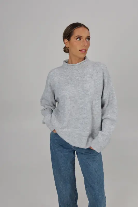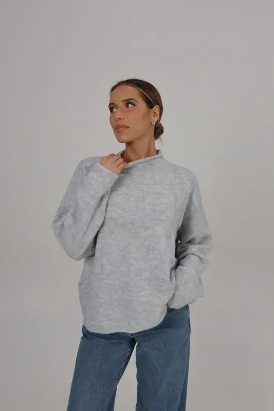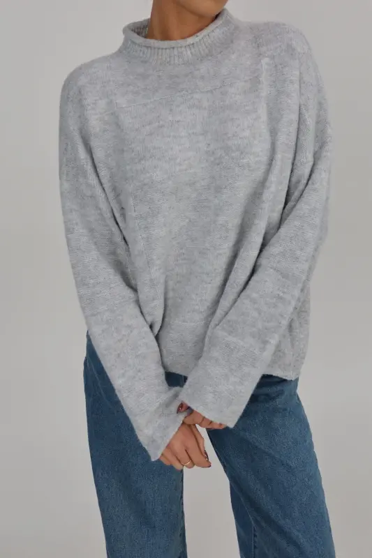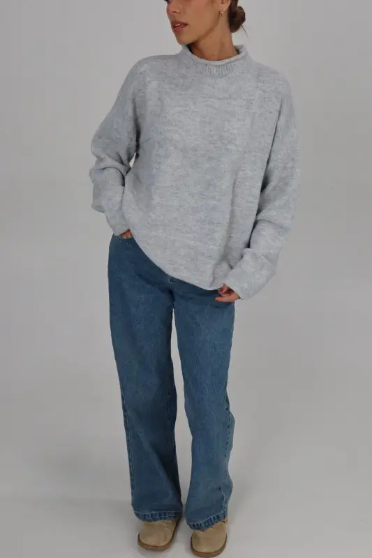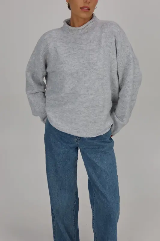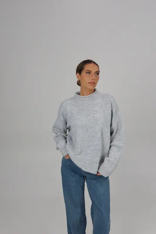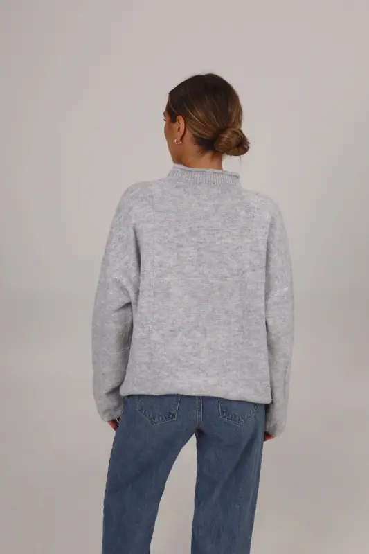 Our Ryleigh Grey Mock Neck Sweater is a soft-to-the-touch knitted sweater with an oversized look but does run true to size. This sweater has a mixed-pattern patchwork detail in the fabric. This is the perfect sweater to keep you warm during those chilly winter days!