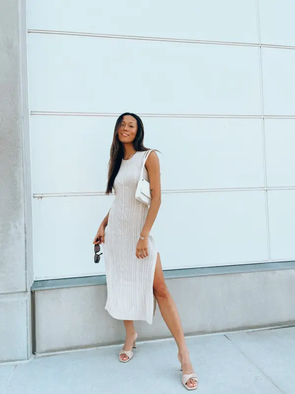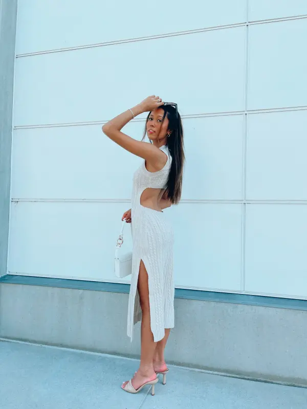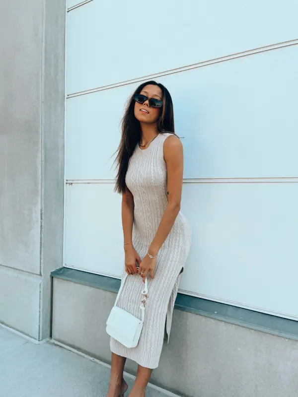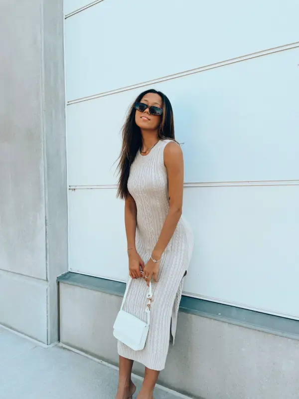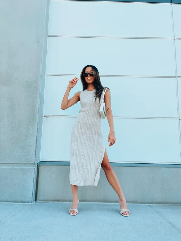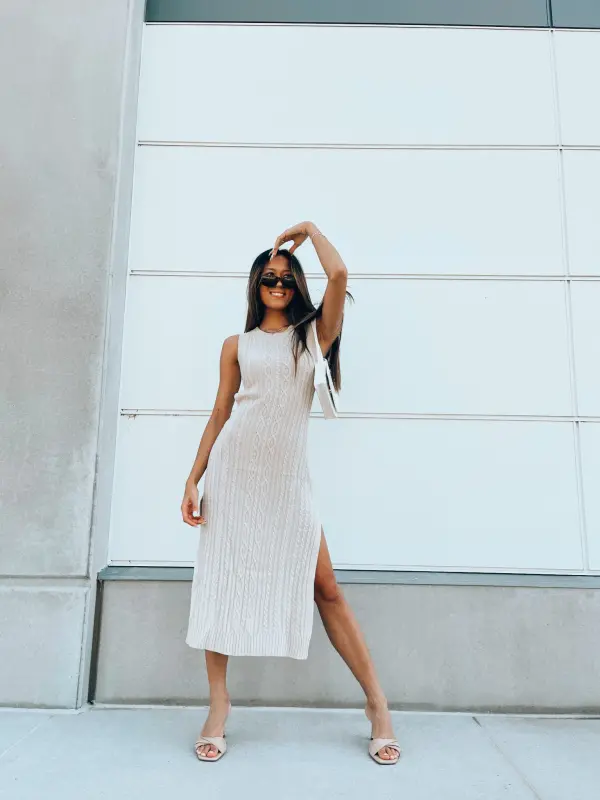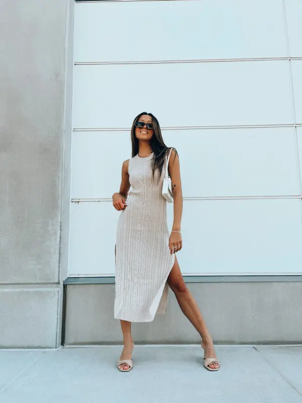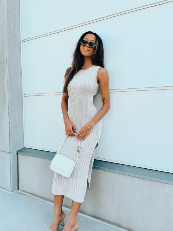 Our Sleeveless Midi Sweater Dress has a knitted fabric that has a good stretch to it. There are two side slits and an open back detail. The inside is NOT LINED.