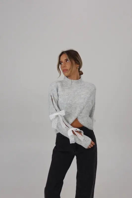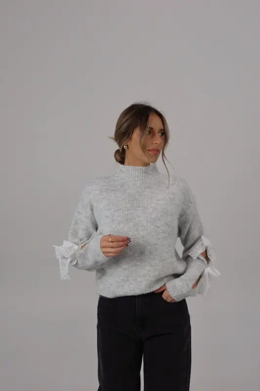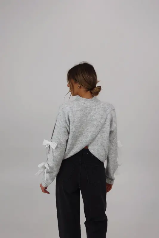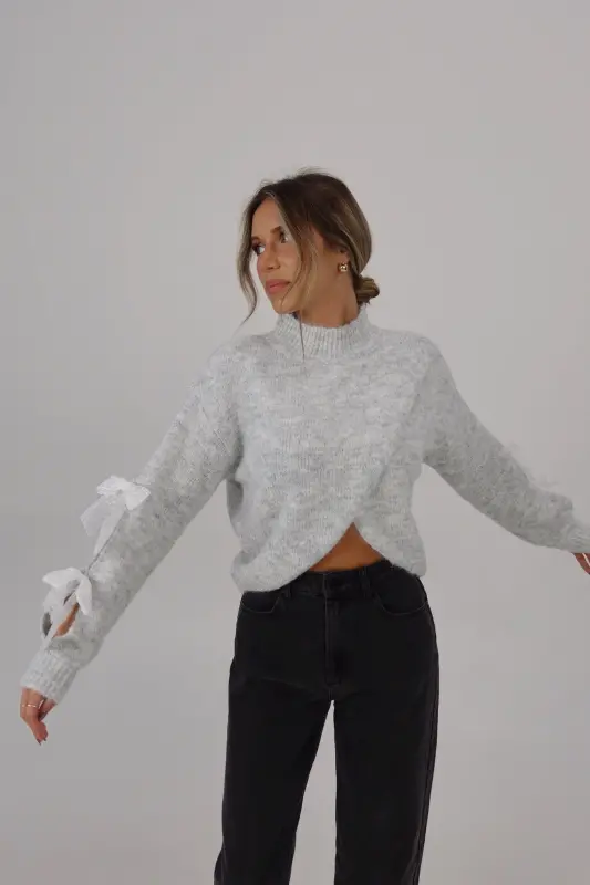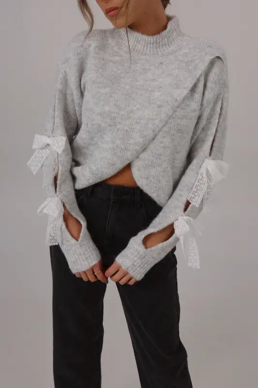 Embrace romantic whimsy with our beautifully detailed cropped sweater. The elegant cross-front design creates a flattering silhouette, while the thoughtfully placed sleeve slits are adorned with delicate ribbon bows for an enchanting touch. Each long sleeve features carefully crafted openings, embellished with feminine bow details that add movement and charm to every gesture. This isn't just a sweater – it's a statement piece that combines the comfort of knitwear with ballet-inspired elegance. Perfect for those who love their basics with a dash of drama, this crop top pairs beautifully with high-waisted bottoms for a balanced look that's both sweet and sophisticated.